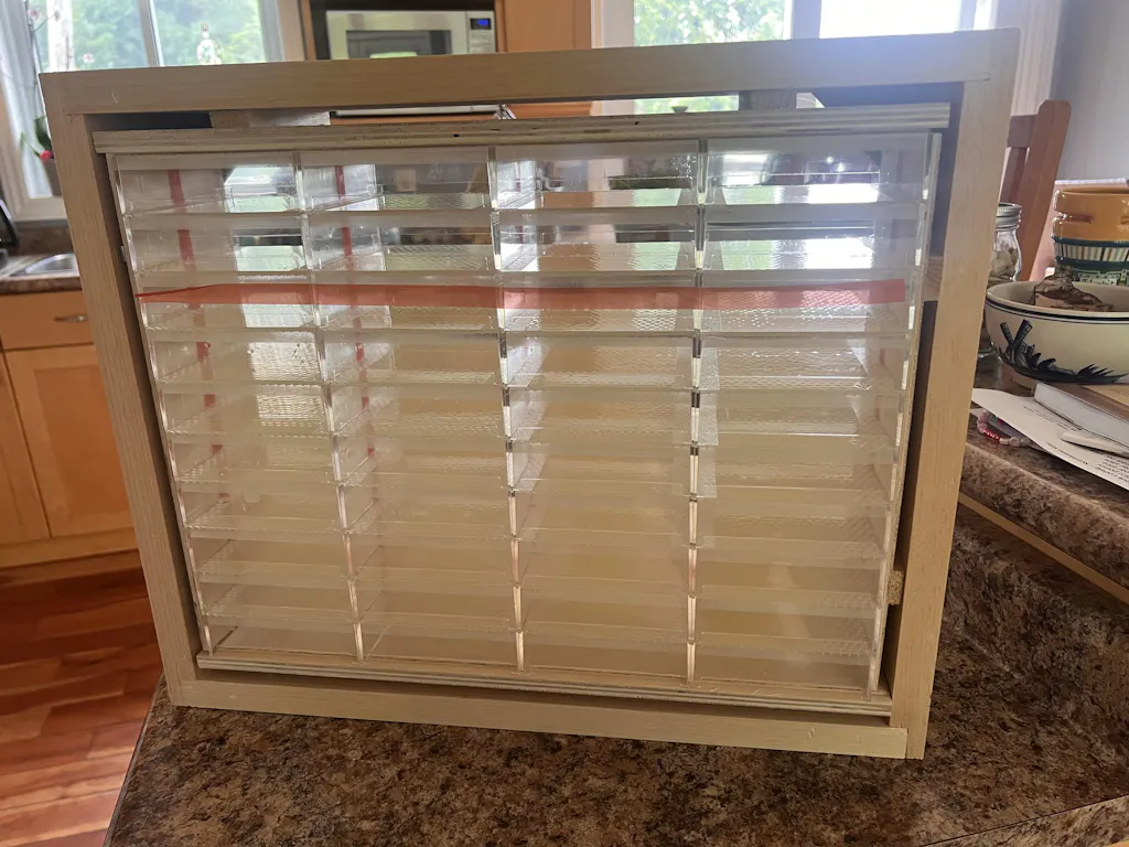 The bottoms of each clear plastic tray are coated with pure beeswax cut comb foundation and are readily accepted by bees. When sections are full they are removed as a unit from the super, separated into individual trays and covers (included) are placed on the combs.